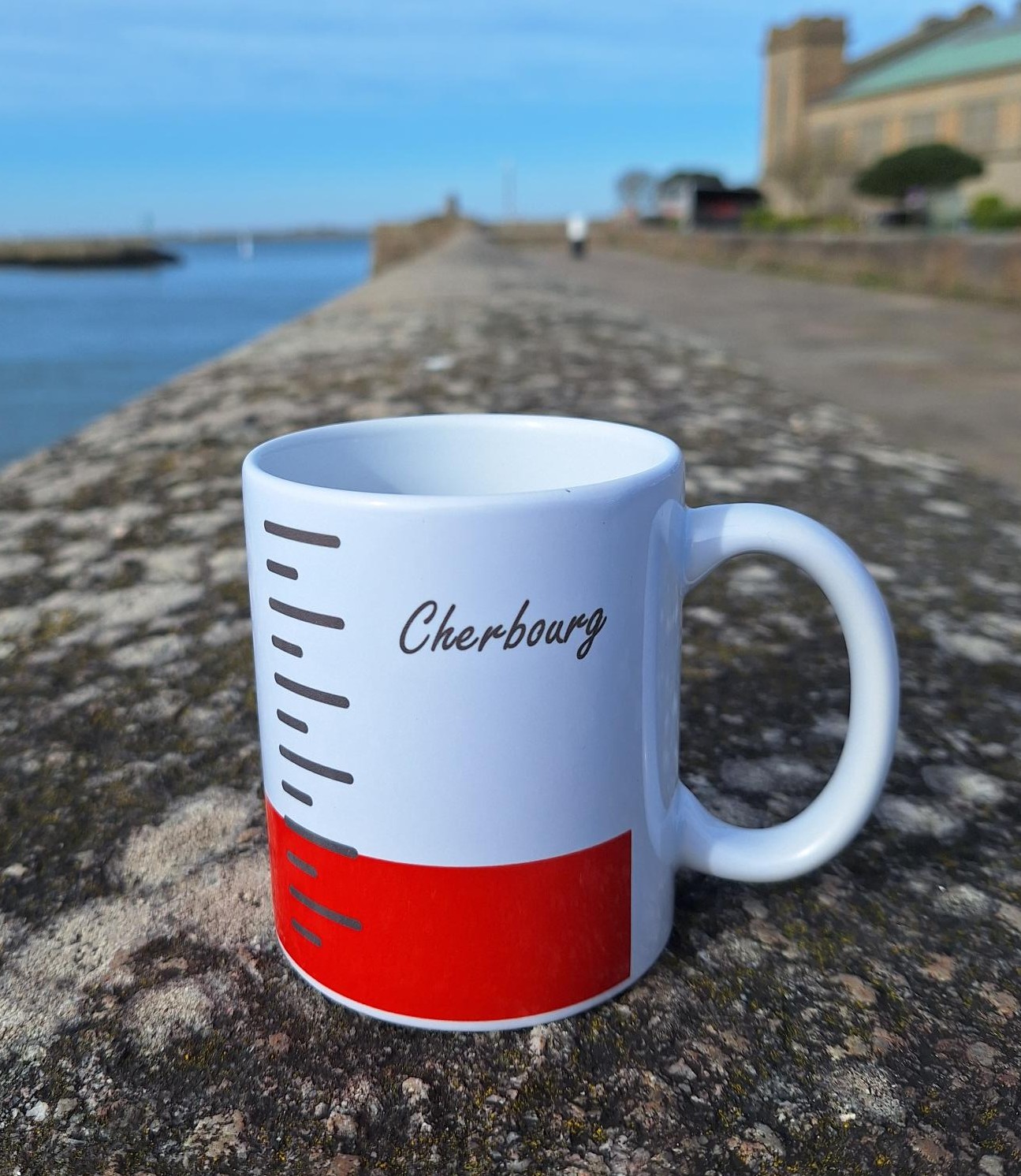 Le décor sur le mug est panoramique. L’échelle de tirant d’eau et l’annotation Cherbourg sont présents des 2 côtés du mug pour nos marins droitiers aussi bien que gauchers 🙂